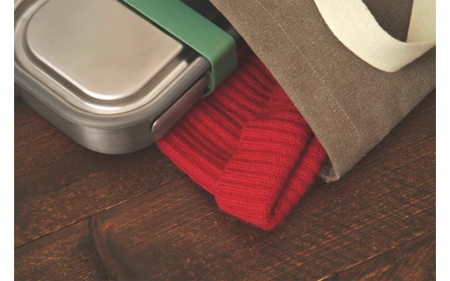 The silicone valve creates a secure, vacuum-tight seal. The adjustable divider allows you to separate foods. The fork & strap were added for convenience. Thus, the perfect plastic-free lunch box: dimensions: 20 × 15 × 6.5 cm.