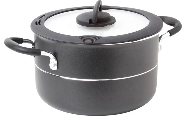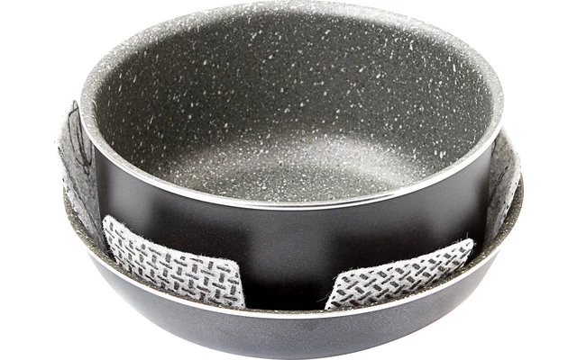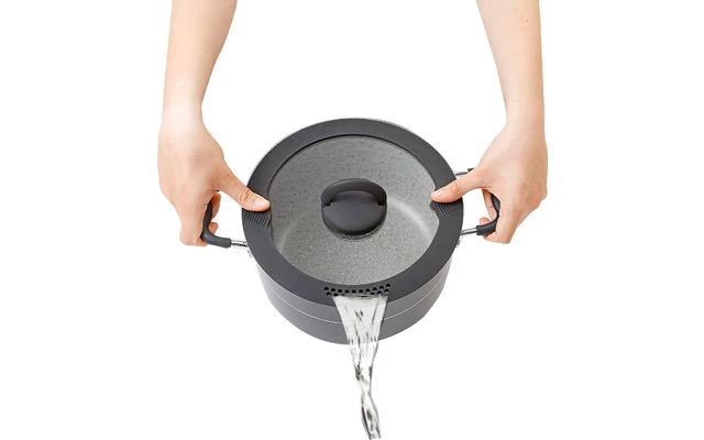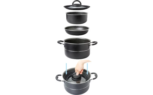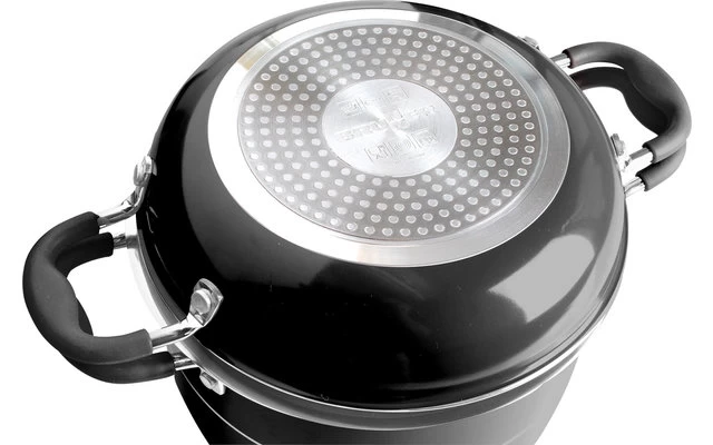 9-piece aluminium pot set with new VACUBLOCK technology and high-quality non-stick coating in modern Stone Rock design. Including practical universal glass lid with stepped silicone rim and steam hole for pressure equalisation – fits pots and pans with three different diameters. The second glass lid with silicone noise protection rim is perfected by integrated drip holes for easy pouring and a slot for easy attachment of the grip pliers. Both glass lids are equipped with space-saving folding handles