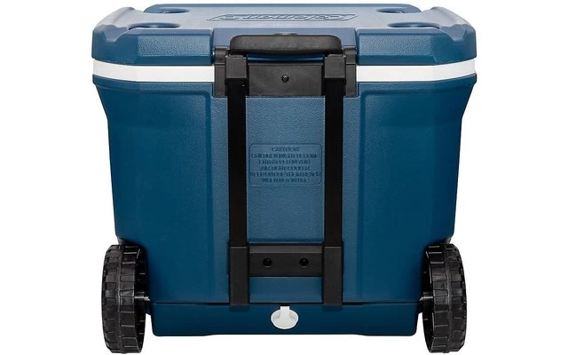 Cooler box with wheels and height adjustable telescopic handle.