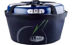 The set consists of two pots (2 and 3 liters), two pot lids with pouring holes, a frying pan, four double-walled cups including lid as well as four plates, a folding handle and a waterproof packing bag.