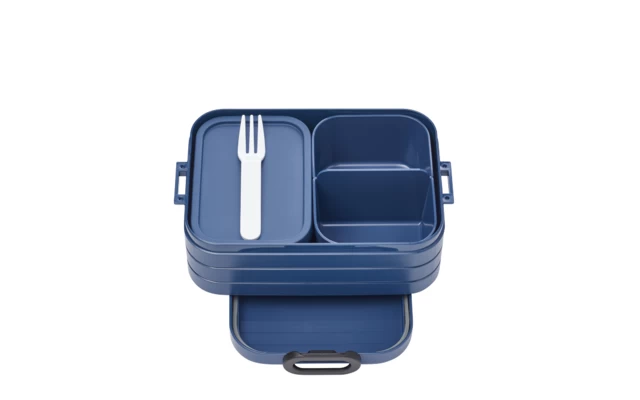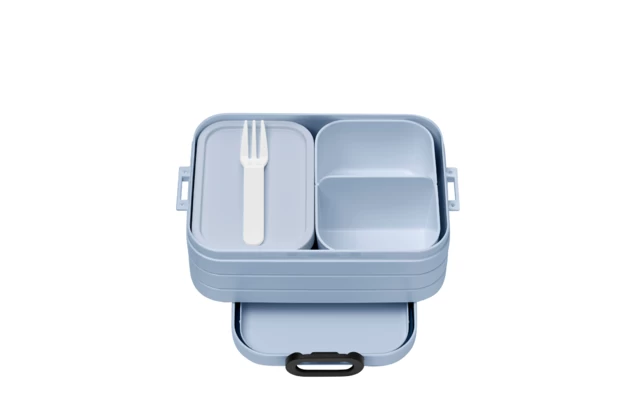 Lunchbox TAB midi including bento boxes. Leftovers from the day before? Now you can easily take them with you and enjoy them again! The bento insert with two different compartments and the extra box with lid and fork allow for a versatile and varied meal and snacks on the go. The two bento inserts are even microwaveable without lids. So you can always create new, delicious snacks and combinations for on the go.