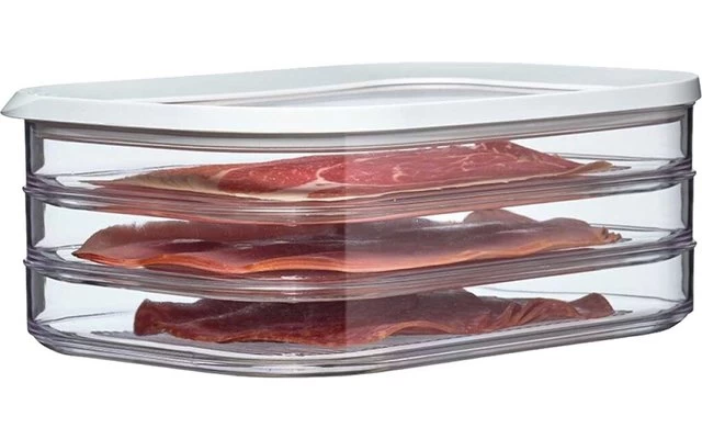 The transparent lid with white rim and sealing ring ensures a perfect closure, making these Modula tins ideal for storing various cold cuts and meat products