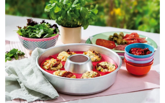 The foldable, flexible muffin pan is space-saving and ensures easy filling and optimal extraction of the baked goods. With sample recipes.