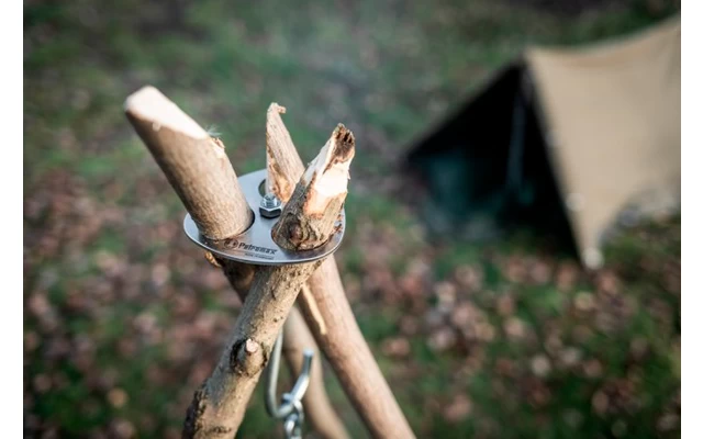 The Tripod Ring will fit in any type of luggage, because with 450 g total weight you can easily stow the disc and both hooks and chain and take them with you on your explorations. In the natural environment of your campsite you will find the necessary branches and remain completely independent outdoors. You can also use the tripod ring to build a sturdy shelter or teepee for the night when your hunger is satisfied.