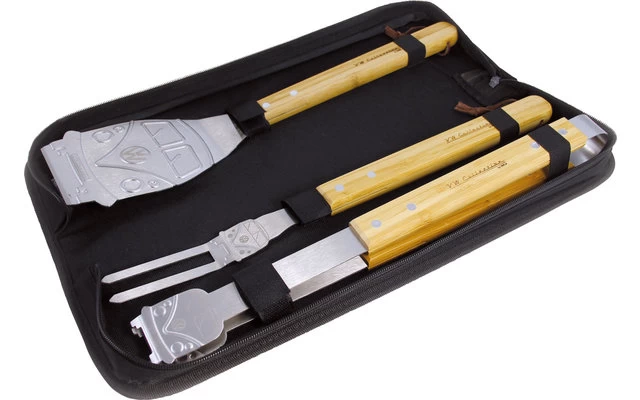 Fancy 3-piece barbecue cutlery set in the iconic VW Bulli design. The high-quality set includes a barbecue fork, a meat turner and barbecue tongs made of stainless steel. All three pieces are equipped with noble bamboo handles (length approx. 43 cm). With the handy case with carrying handle it is perfect for camping friends and real grill masters. Especially great extra: All tools with stamped VW Bulli front!