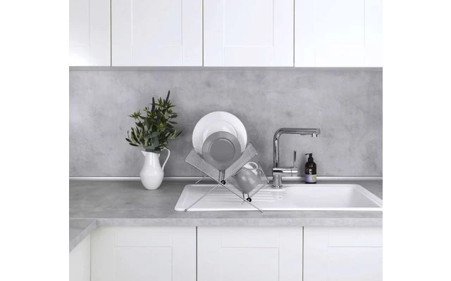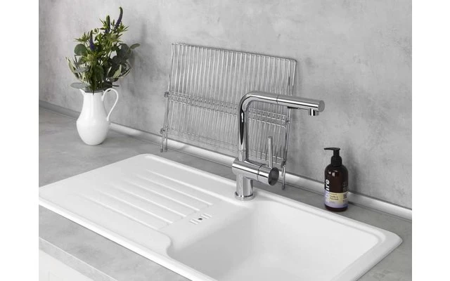 The practical dish drainer Duo made of chrome-plated metal offers plenty of space for plates and dishes with its large storage areas. Since even in the age of dishwashers there are still dishes and cutlery that are better washed by hand, it serves as a functional accessory for the sink in the kitchen, garden shed or mobile home. Due to the cross-shaped design, plates find optimal support on the upper shelf. The side shelf provides space for cups, smaller glasses or cutlery. When not in use, the dish drainer can be folded to save space.